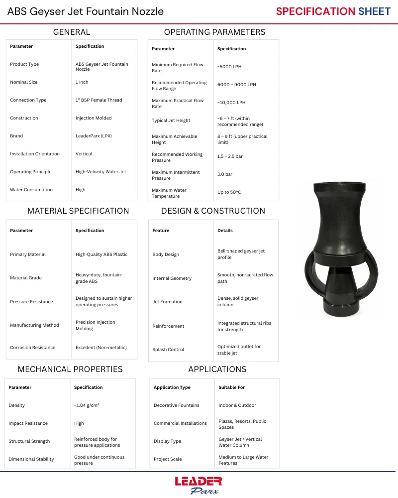With a balance of performance, durability, and affordability, LPX ABS Geyser Jet Nozzles offer a practical solution for creating elegant, reliable, and visually appealing water displays—without compromising on quality or aesthetics.
